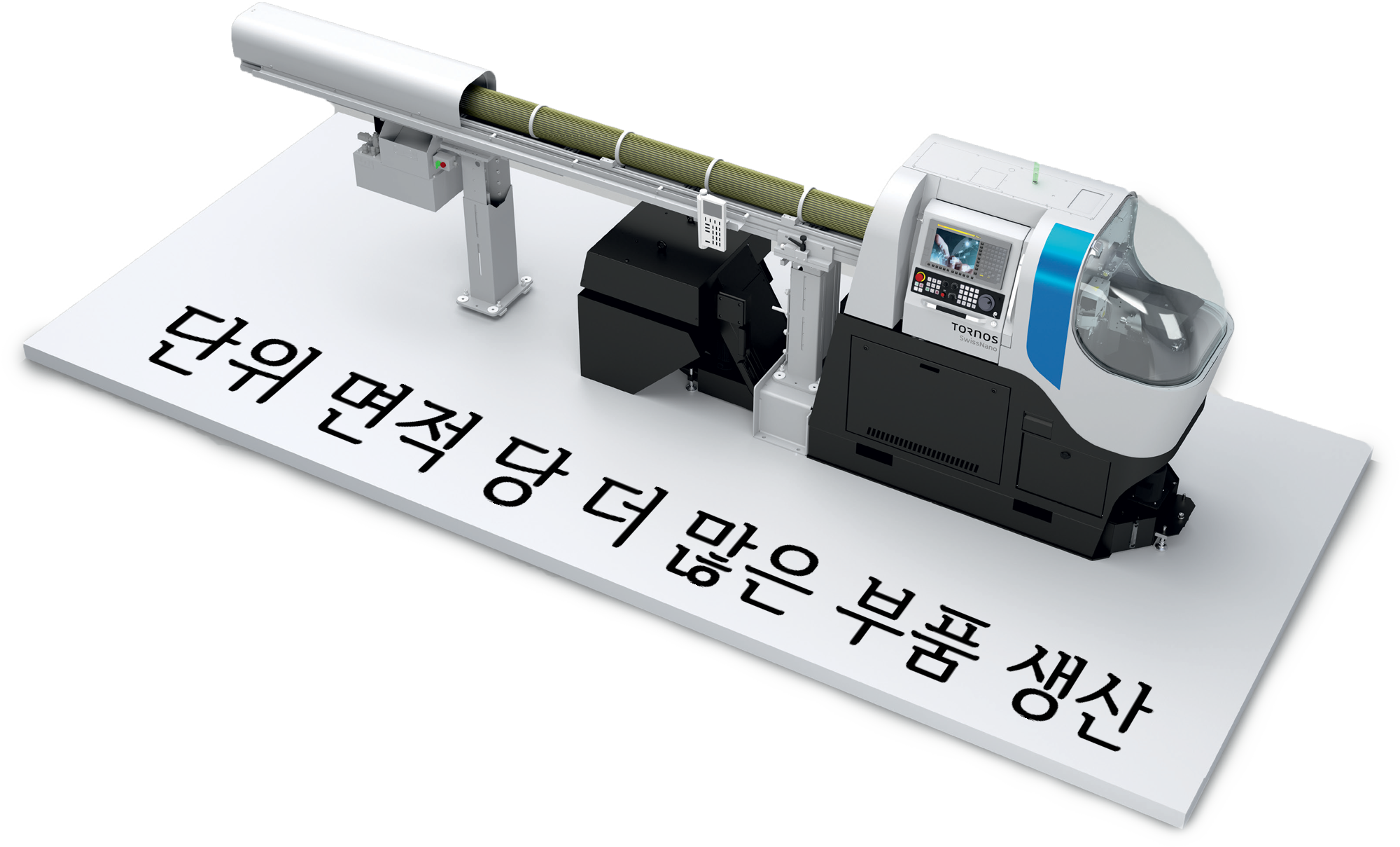 기존 Tornos M7 캠 머신 자리에 그대로 설치 가능하며, 3.2m 폭 안에 3대의 장비를 배치할 수 있어 단위 면적당 생산성이 압도적입니다.